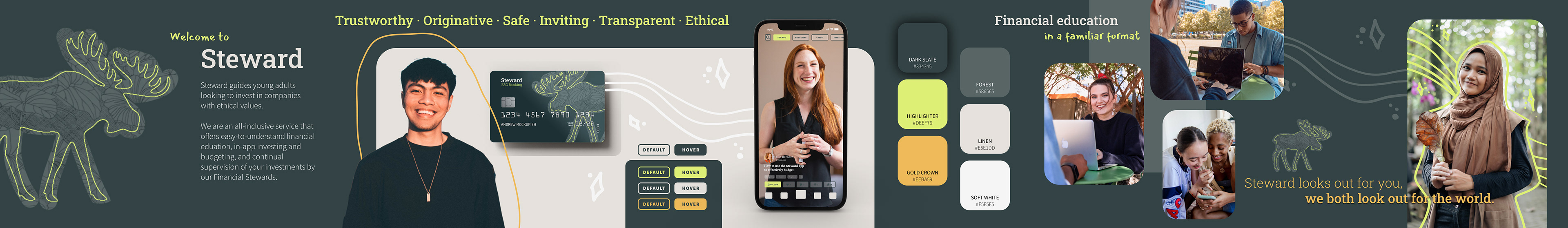 Steward is an investment and financial literacy service for young adults (18-25 years old) that makes complex financial information approachable while offering ethical wealth management options. This inclusive product offers easy-to-understand financial education content, in-app investing options, and fiscal guidance from certified experts.